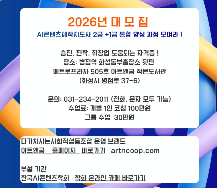 Posted 2026 / AI콘텐츠제작지도사 2급 1급 통합 양성과정 종료(1급 인재 학습동아리지원)