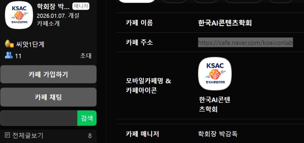 Posted 2026 / 한국AI콘텐츠학회 설립 및 온라인 카페 오픈 네이버 카페 KOAIconlab